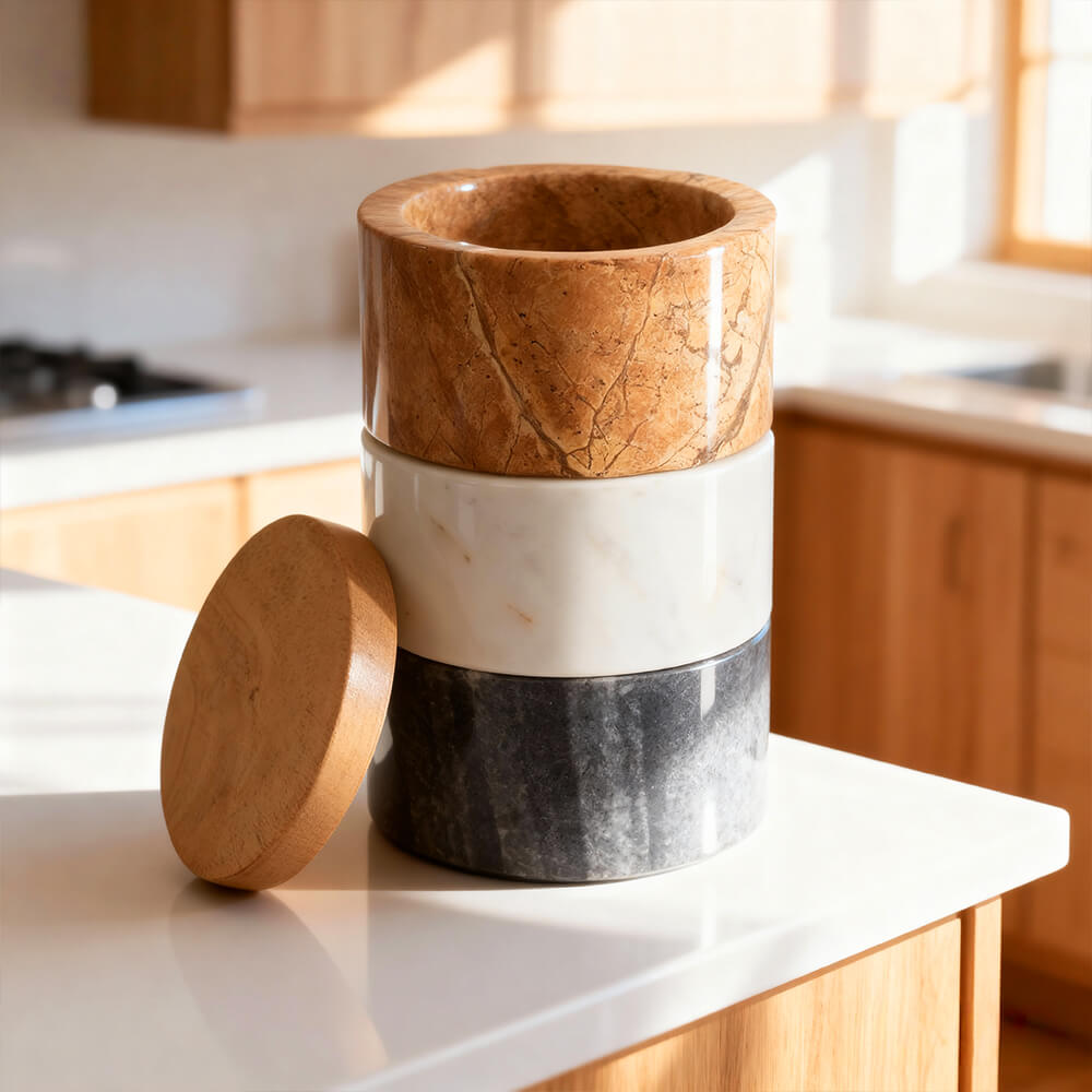Marble Salt Cellar Stacking Set with Wood Lids White Gray and Brown