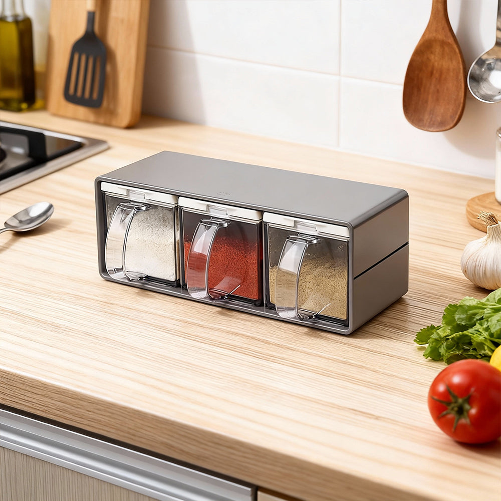 - Included Components: 3 seasoning boxes, 3 spoons, 1 rack
