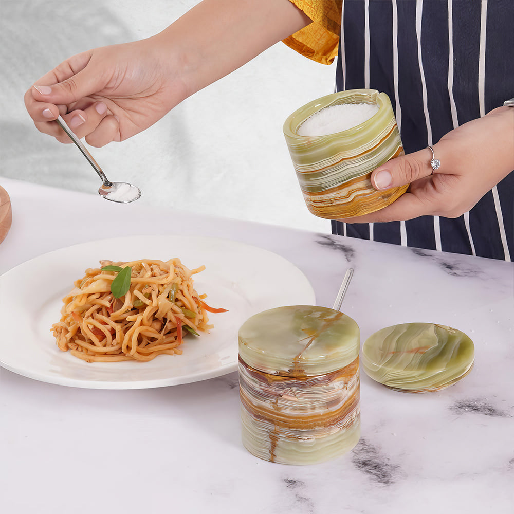 Each set includes two marble salt cellars, each with a matching lid and spoon, making it easy to keep salt, sugar, and spices organized, dry, and within reach during cooking or serving.